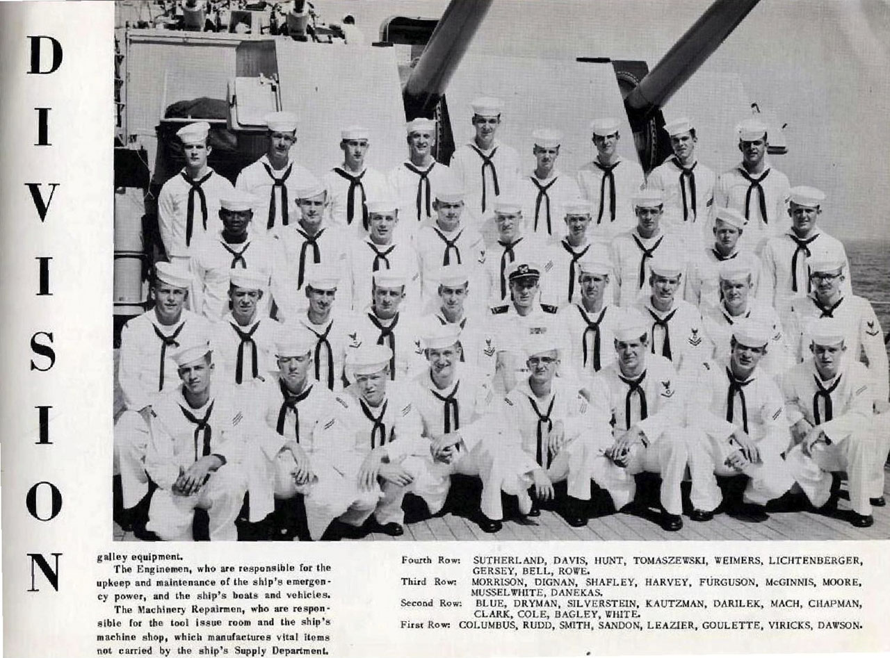 J’étais à bord du Des Moines du 15 février 1957 au 12 août 1960. Nous avons traversé l’Atlantique pour Villefranche-sur-Mer en milieu d’année 1958 et j’ai été affecté là-bas jusqu’en Août 1960. Au moment où ces photos ont été prises, j’étais second-maître 2e classe, E5. J’ai été promu E6 (maître) juste avant la fin de mon service. J’étais aussi allé à l’école de plongée de la Marine et pendant que j’étais en Méditerranée, j’enseignais la plongée aux autres marins.